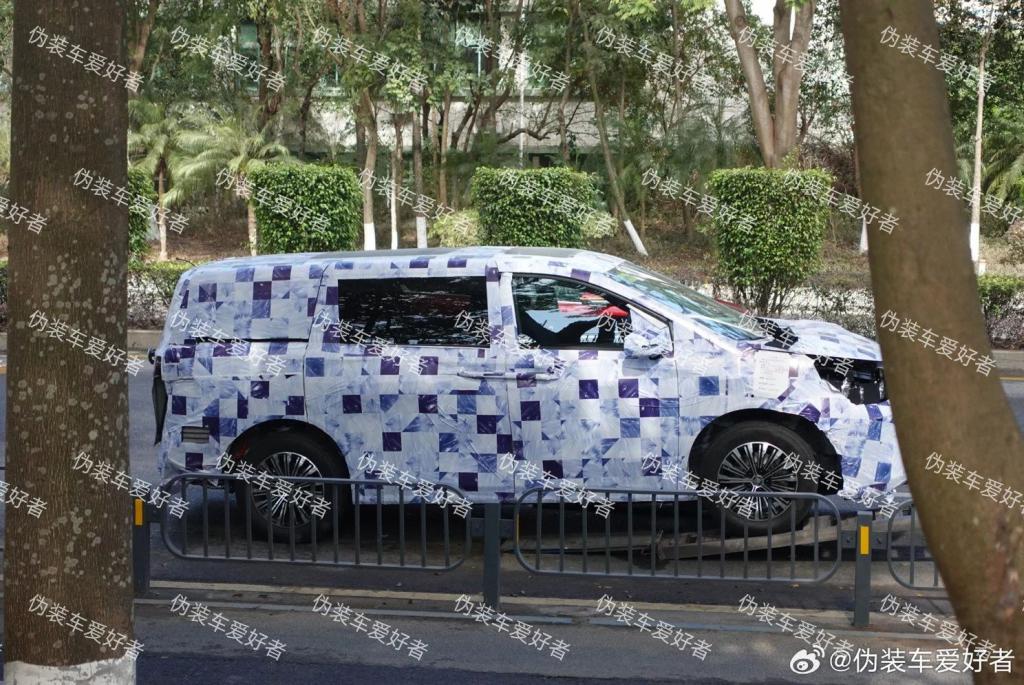 车身侧面,整体造型较为方正,平直腰线贯穿始终,后排车门依旧采用侧滑门的打开方式。车身尺寸方面,以路边的护栏作为参照,侧面车身大概为两节护栏多一点的长度,类似的街边护栏一节长度为 2 米左右,可以推断,新车的长度应该在 5 米左右,大概率在 5 米以内。