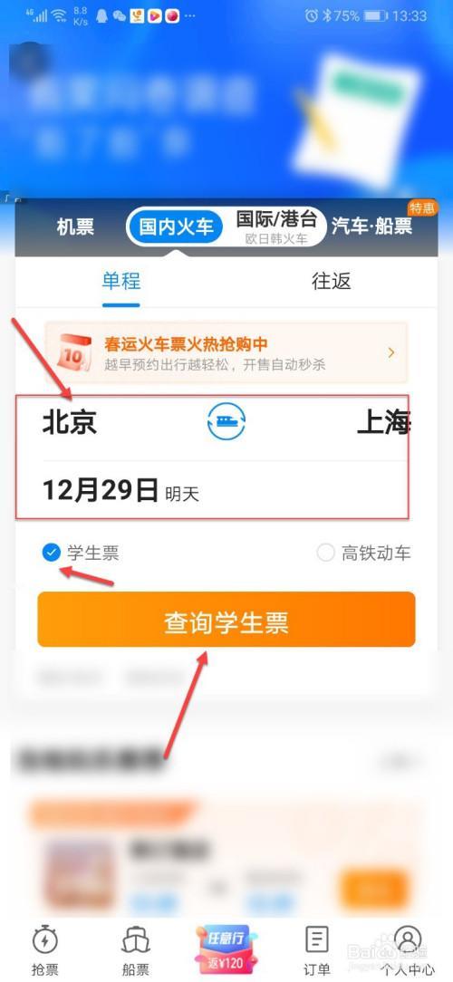 在携程网站的首页上,你可以看到一个搜索框。在搜索框中,你需要输入你的出发地和目的地城市的名称,并选择出发日期和火车类型等详细信息。
