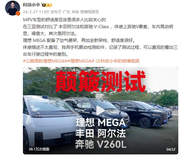 快科技 2 月 27 日消息,今日,有博主对理想 MEGA、奔驰 V260L、丰田阿尔法三辆车进行舒适度检验。
