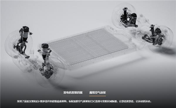 理想 MEGA 采用魔毯空气悬架 , 即前双叉臂和后 H 臂多连杆的超级底盘架构,标配双腔空气悬架和 CDC 连续可变阻尼减振器,大幅提升了车辆的稳定性和舒适感。