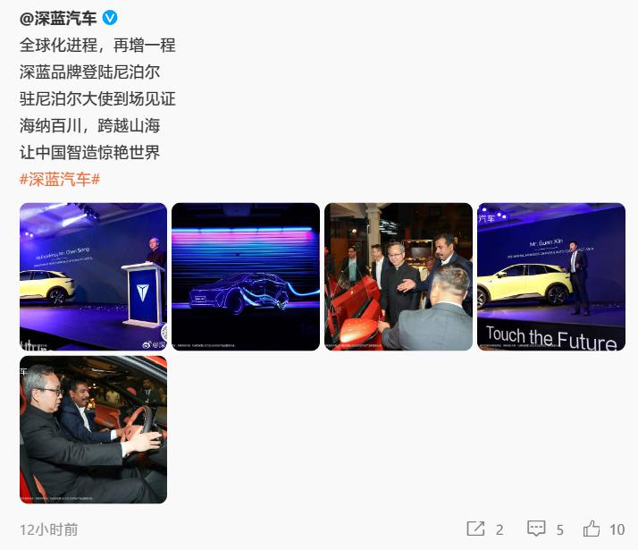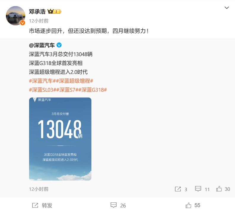 深蓝汽车 CEO 邓承浩转发交付数据微博并称," 市场逐步回升,但还没达到预期,四月继续努力!" 值得一提的是,深蓝汽车昨日还宣布登陆尼泊尔市场,驻尼泊尔大使到场见证。