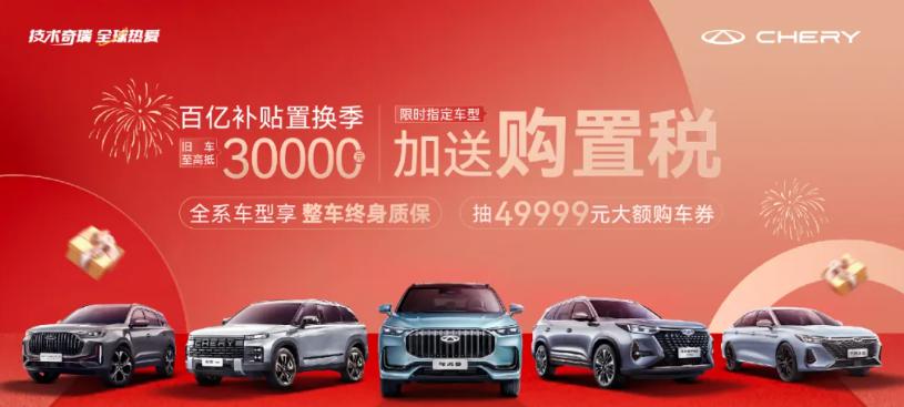 4 月 1 日,奇瑞品牌宣布对 " 百亿补贴置换 " 进行焕新,限时指定车型加送购置税全免,以及旧车至高抵 30000 元等政策。