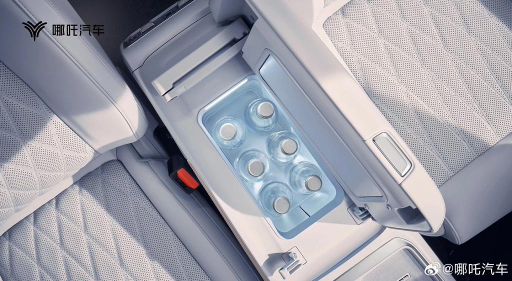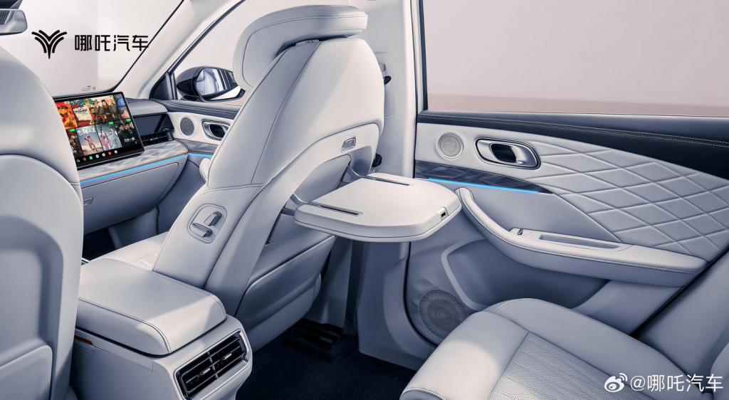 哪吒 L 采用环抱式座舱设计,车内搭载大尺寸双联屏以及车载冰箱,内饰采用浅色简约设计。此外,哪吒 L 车型还为后排老板座配备了小桌板。