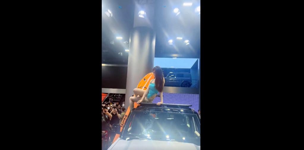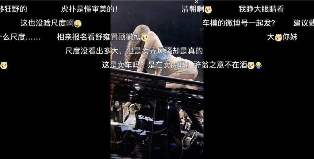 根据网上传出的视频显示,这些被指擦边的模特并不是在穿衣风格上存在不妥,而是在现场做出的各种小动作,其中一女模特身穿蓝色吊带和白色短裤,在车顶上做出各种动作,吸引了大量的观众围观拍照,一时间不知道展出的是车还是人。据了解,备受争议的女模特是为网红 " 小乌苏 Tina",其拥有 137.1 万粉丝,个人主业上提到将于 "8 月 29 日至 9 月 8 日在成都车展奇瑞 ICAR 展台首登,目前该博主尚未公开回应。
