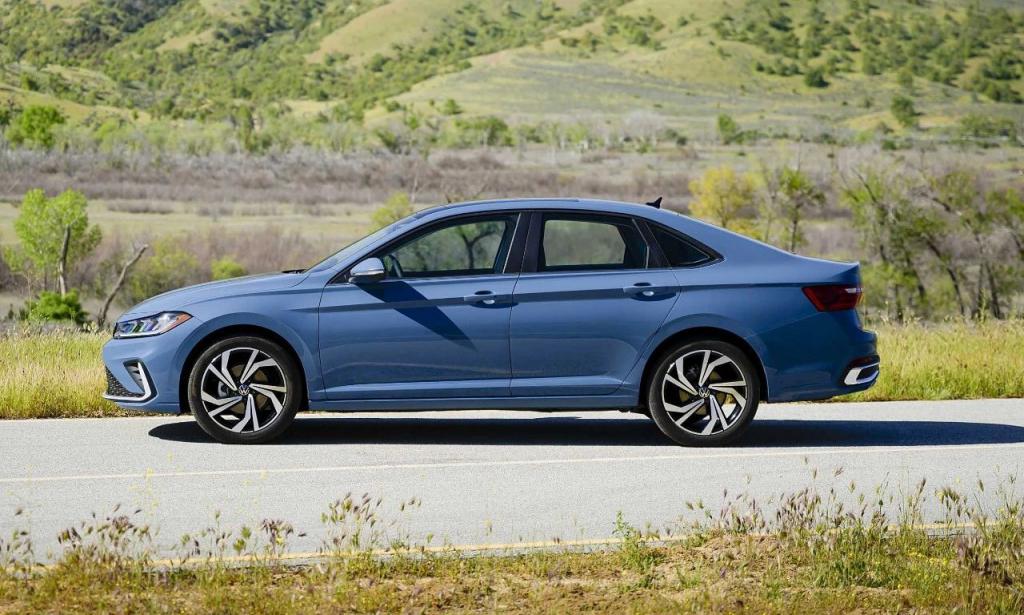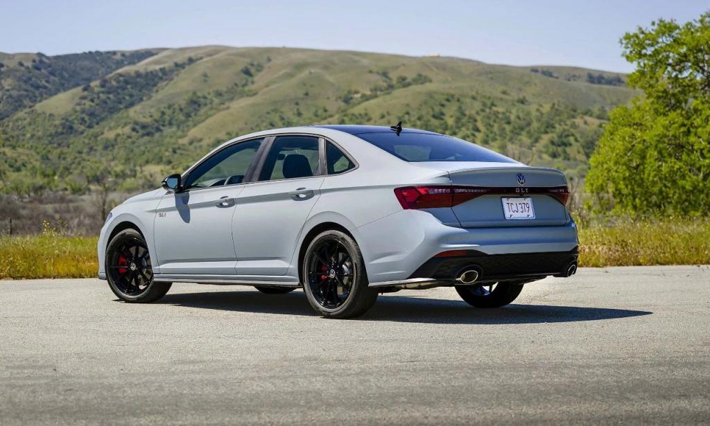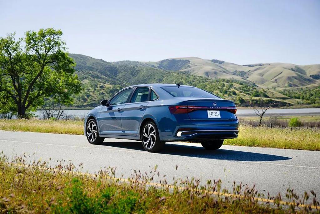 车身侧面,新款 Jetta 采用了贯穿前后车门把手的腰线,令整个侧面视角更显修长,在轮毂选择上,标准版以及 GLI 版本在轮毂、卡钳颜色上有所区别,前者是银色亮面轮毂,搭配最基础的银色卡钳,而 GLI 版本则采用黑色轮毂搭配红色卡钳。