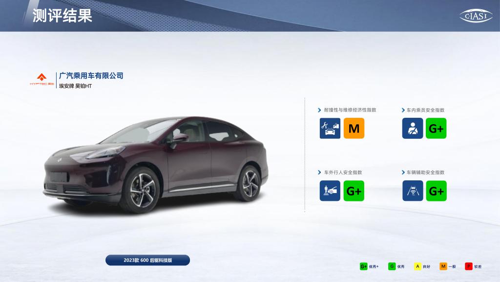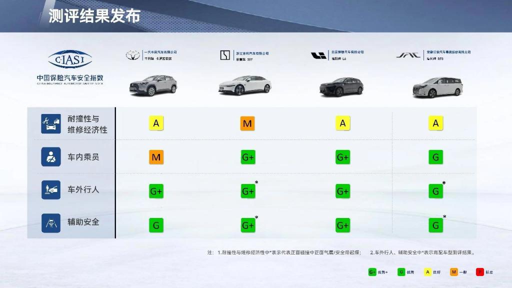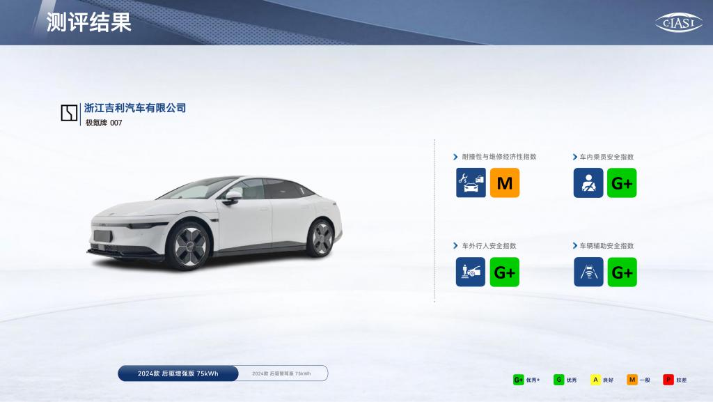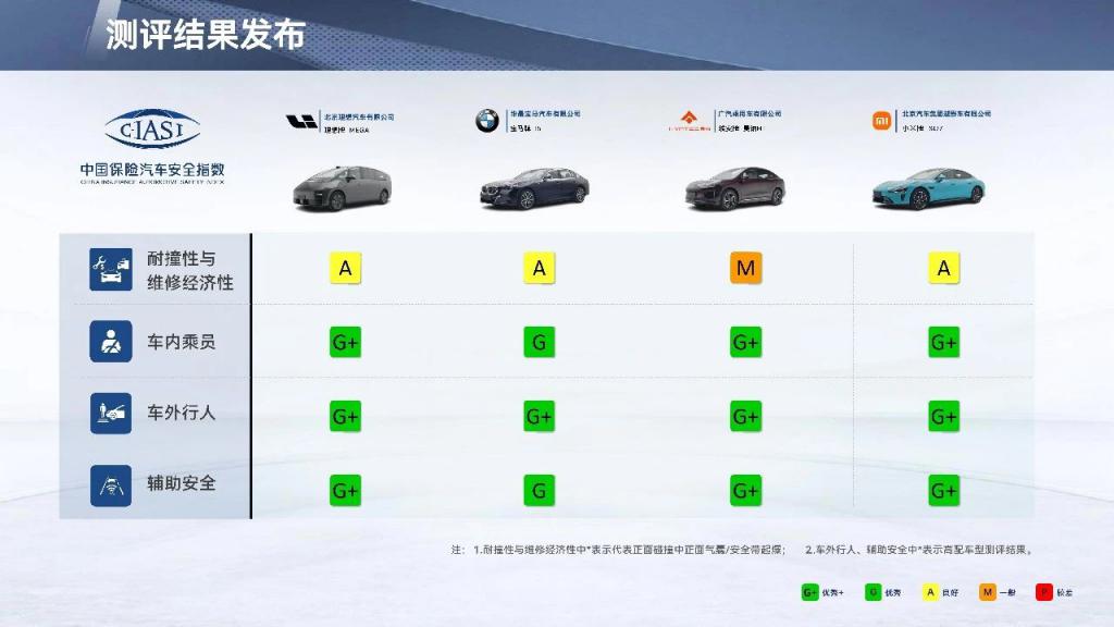 昊铂 HT 和极氪 007 在耐撞性与维修经济性中获得了总体 M(一般)评价,其他车型均为 A(良好)评价。