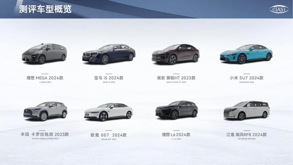 测试结果包括 8 款车型,分别为理想 MEGA、宝马 i5、昊铂 HT、小米 SU7、丰田卡罗拉锐放、极氪 007、理想 L6 以及江淮瑞风 RF8。其中江淮瑞风 RF8 和一汽丰田卡罗拉锐放为燃油车,其余 6 款为新能源车。