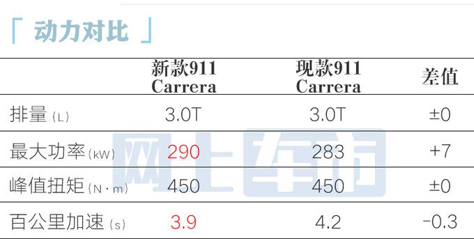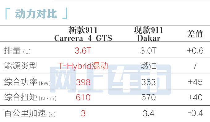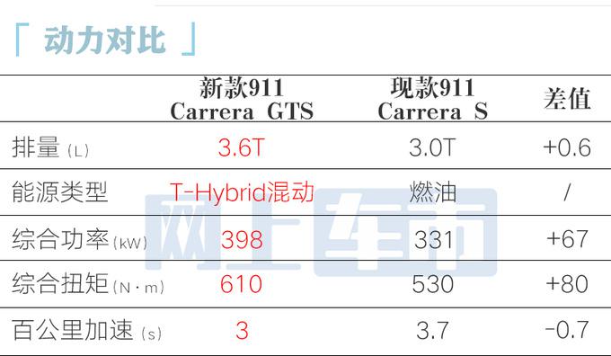 新 911 Carrera 搭载经过全面优化的 3.0T 发动机,配备此前仅限于 GTS 车型的涡轮增压器。911 Carrera GTS 搭载全新研发的 3.6T 发动机,最大功率 357kW,峰值扭矩 570N · m;电机集成在新款 8 速 PDK 双离合传动系统中,最大功率 48kW,峰值扭矩 150N · m。