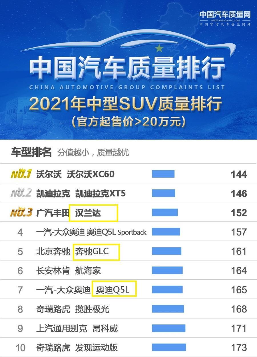 对于质量最好的十大中型SUV,汉兰达、奔驰GLC前五,宝马X3和途观L遗憾落榜,大家对此怎么看呢?