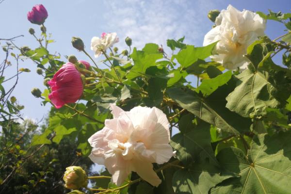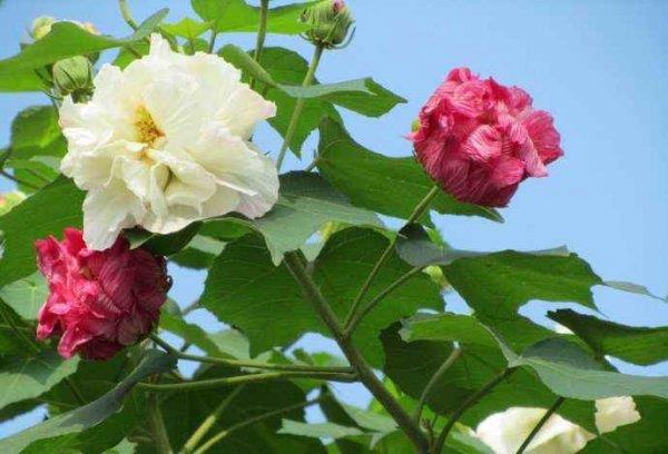 木芙蓉在北方地区种植不是很普遍,因此很多人不识。每每在庭院池畔见到它艳丽的身的影,也不知其名。在刚开的时候,弄色木芙蓉花瓣一般都是呈现干净的纯白色,等到第二天就会逐渐变为浅红色,之后随着生长天数的增加,花瓣内的色素浓度也越来越高,从而花瓣的红色就会变得更重,最终变为深红色,但是等到花朵快要凋谢的时候,花瓣颜色则会红得发紫,在变为紫色后就逐渐的落下枯死。
