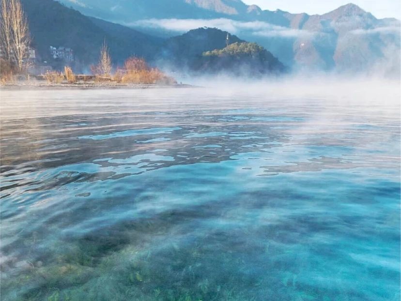 湖水最大透明度达12米,清澈得可以看见湖底的鱼儿在自由自在地游弋。湖内有一小岛,与周围的湖光山色相映成趣,更增添了几分神秘与宁静。