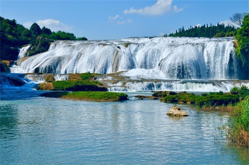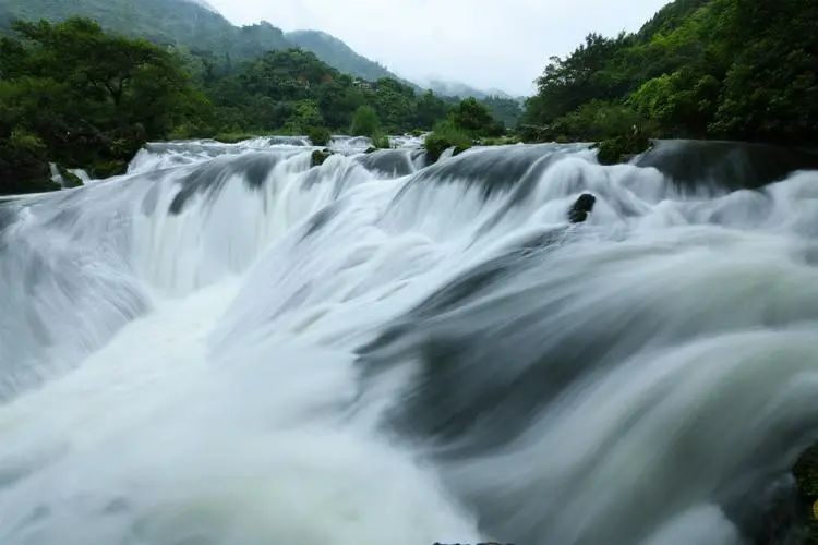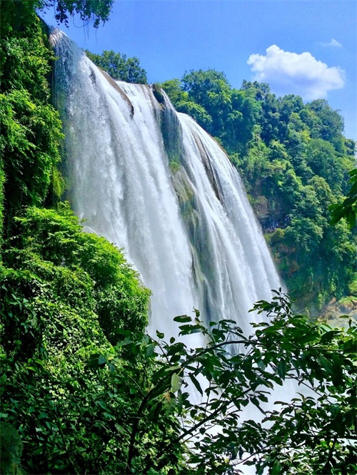 黄果树瀑布以其壮丽的飞流直下景观而闻名于世。每年夏季和秋季,当水量充沛时,瀑布的水势更是汹涌澎湃,仿佛一条巨龙从山间腾空而起,直扑而下。