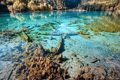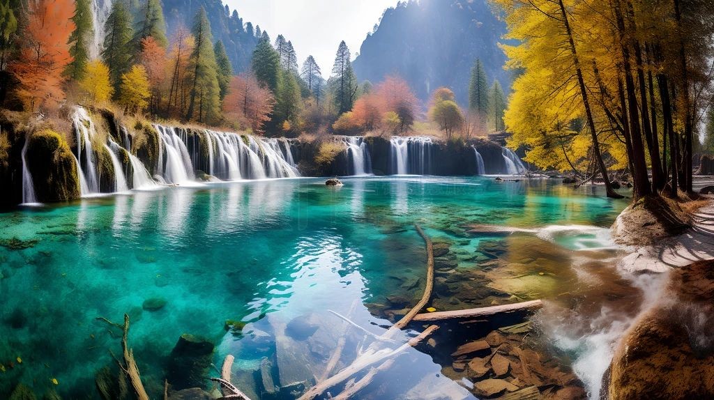 九寨沟的水景是其最为独特和引人入胜的地方。这里有大小湖泊108个,瀑布群27处,其中以诺日朗瀑布最为壮观。
