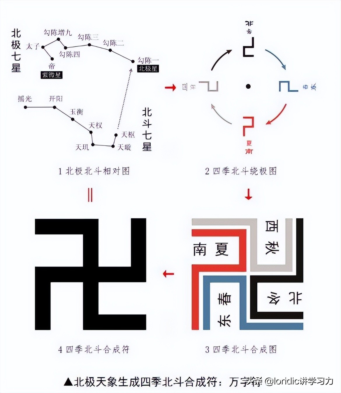 从图17我们知道,万字符是北斗七星四季图组合而成,它跟先天八卦也是一致的。因为先天八卦能够描述天象,包括北斗七星的运动规律。
