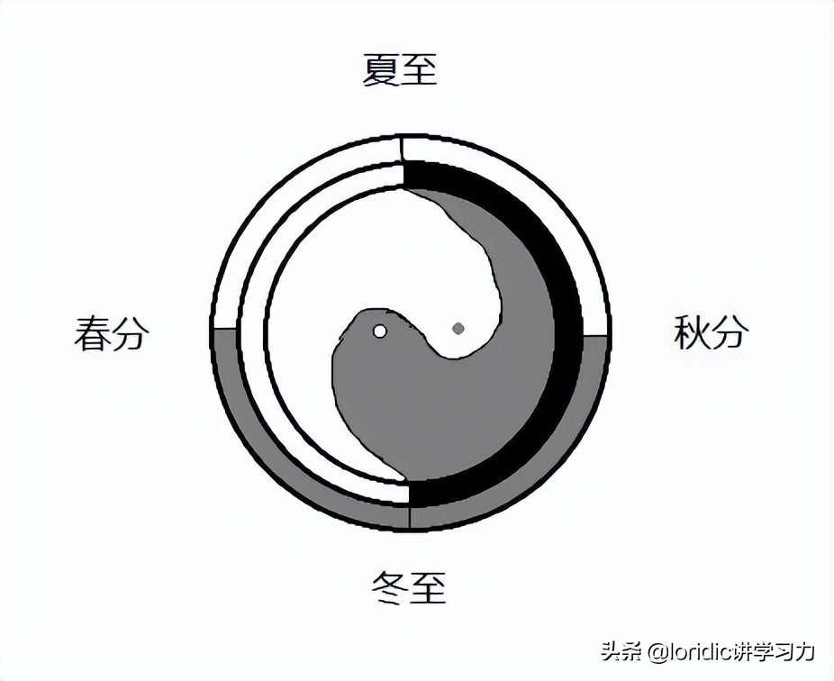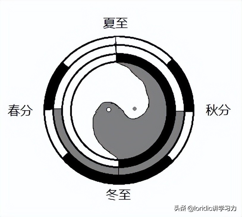 图2中,黑色/灰色表示阴,白色表示阳。中间是太极,生出两个半圆,这是比较粗糙的2分法。左边为阳,右边为阴。用一年来讲解(一日的冷热变化也一致),对应冬至极阴生阳,夏至极阳生阴,顺时针发展。冬至~夏至为阳,放左边。夏至~冬至为阴,放右边。