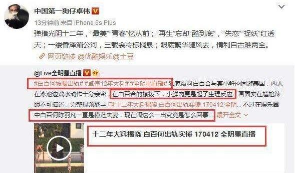 2017年4月12日,号称“中国第一狗仔”的卓伟放出了一波猛料:图片上的白百何正和某个不知名的小鲜肉在泰国的某一泳池边嬉戏打闹。