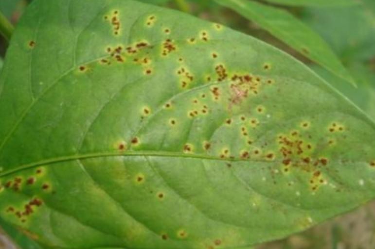 黄瓜、西瓜等葫芦科植物易患。叶片发病初期为水渍状小斑点,后扩大成多角形病斑,颜色由淡褐变黄褐,病斑背面有白色菌脓溢出,干燥时开裂穿孔。病原菌在种子、病残体上,经雨水、昆虫传播,从气孔等自然孔口侵入,高温高湿、种植过密、通风透光差易发病。