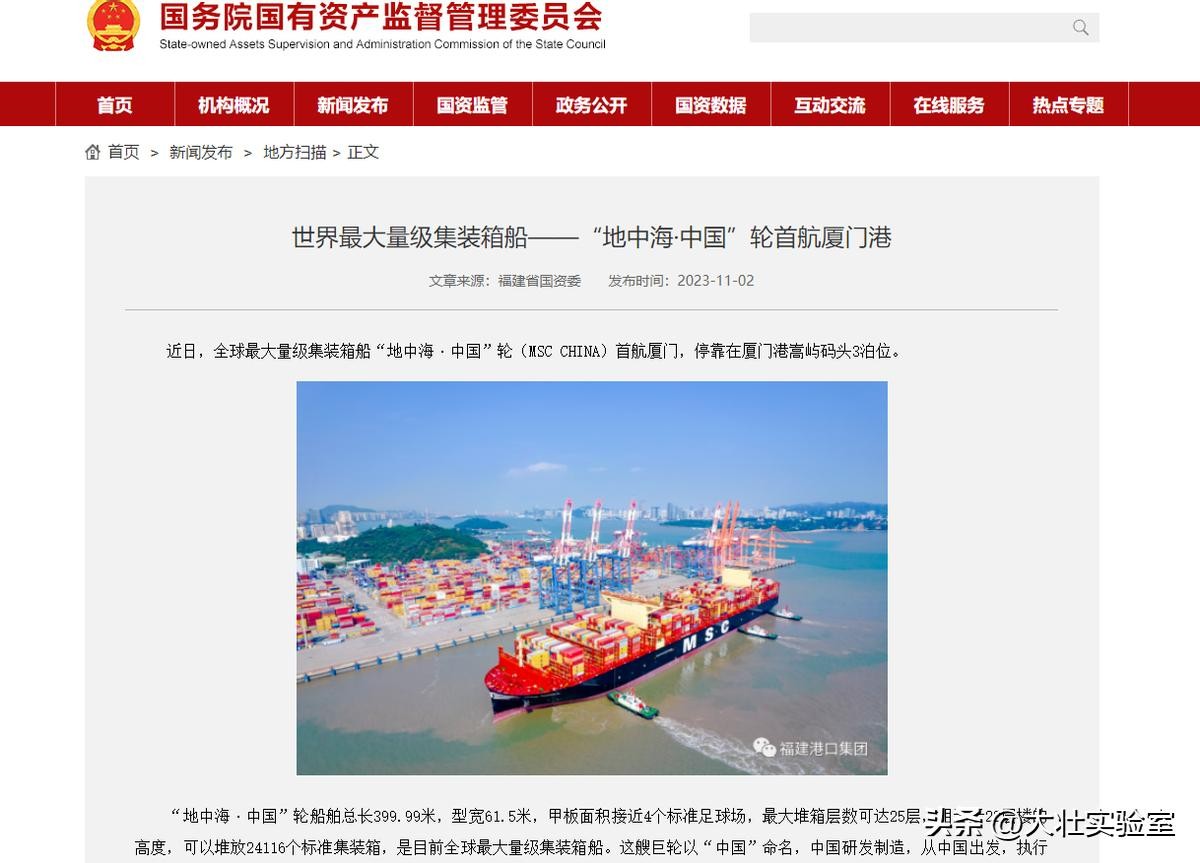国务院国有资产监督管理委员会——《世界最大量级集装箱船——“地中海·中国”轮首航厦门港》2023-11-02