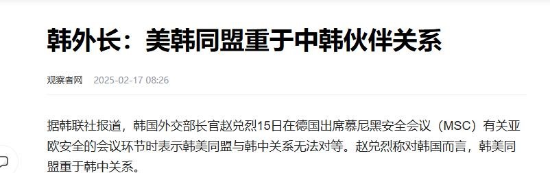 来源:观察者网2025-02-17——《韩外长:美韩同盟重于中韩伙伴关系》的报道