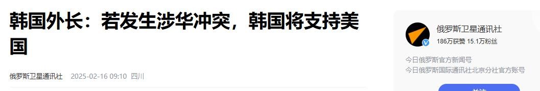 俄罗斯卫星通讯社2025-02-16——《韩国外长:若发生涉华冲突,韩国将支持美国》的报道