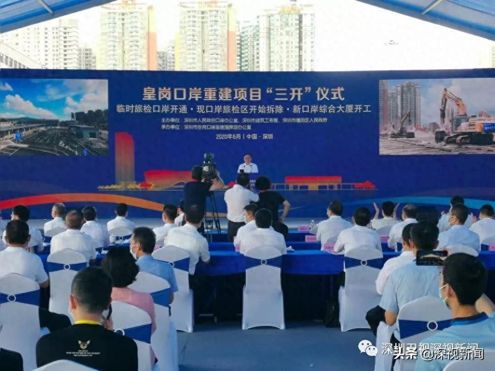 王伟中书记宣布皇岗口岸重建“三开”启动,在施工机械的轰鸣中,新口岸综合大厦破土动工,现口岸旅检区启动拆除,新建的临时旅检场地开始模拟通关。