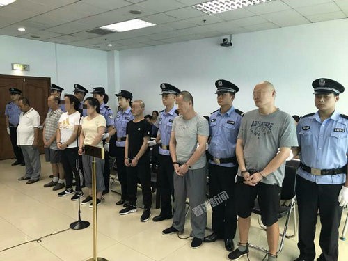 7名被告人中有2名女子---21岁的陈雨辰和35岁的王芬霞,2人神情黯淡走到被告人席上,而坐在旁听席上的亲属中有人捂住脸哭了。
