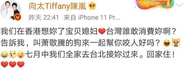 “我们在香港想你了宝宝儿媳妇,台湾谁敢消费你啊?告诉我,叫萧敬腾的狗来一起帮你咬人好吗?七月中我们全国去台北接你过来,回家住!”