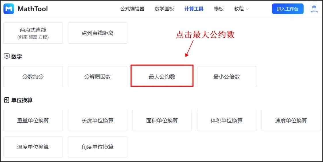 点击后就可以看到一大堆计算工具,我们从【数字】中点击【最大公约数】。