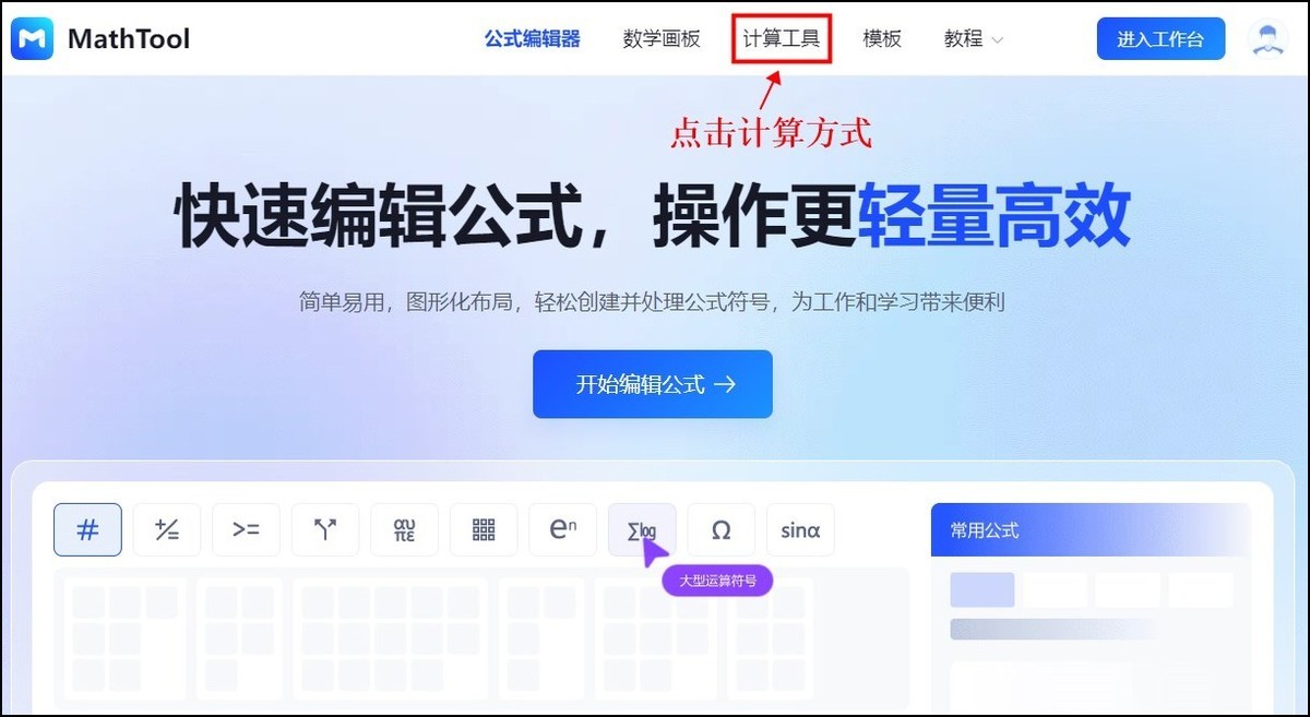 首先,我们打开网页,搜索关键词就可以进入官网,可以看到整个工具的介绍以及简易的操作界面,我们可以点击上方第三个【计算方式】。