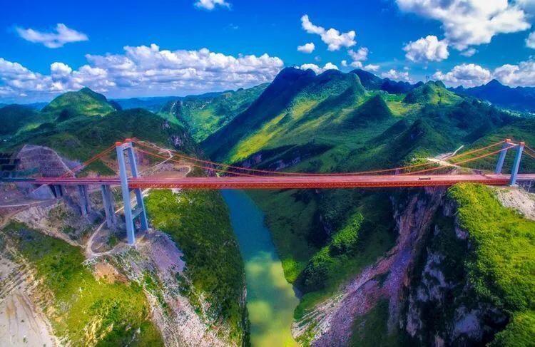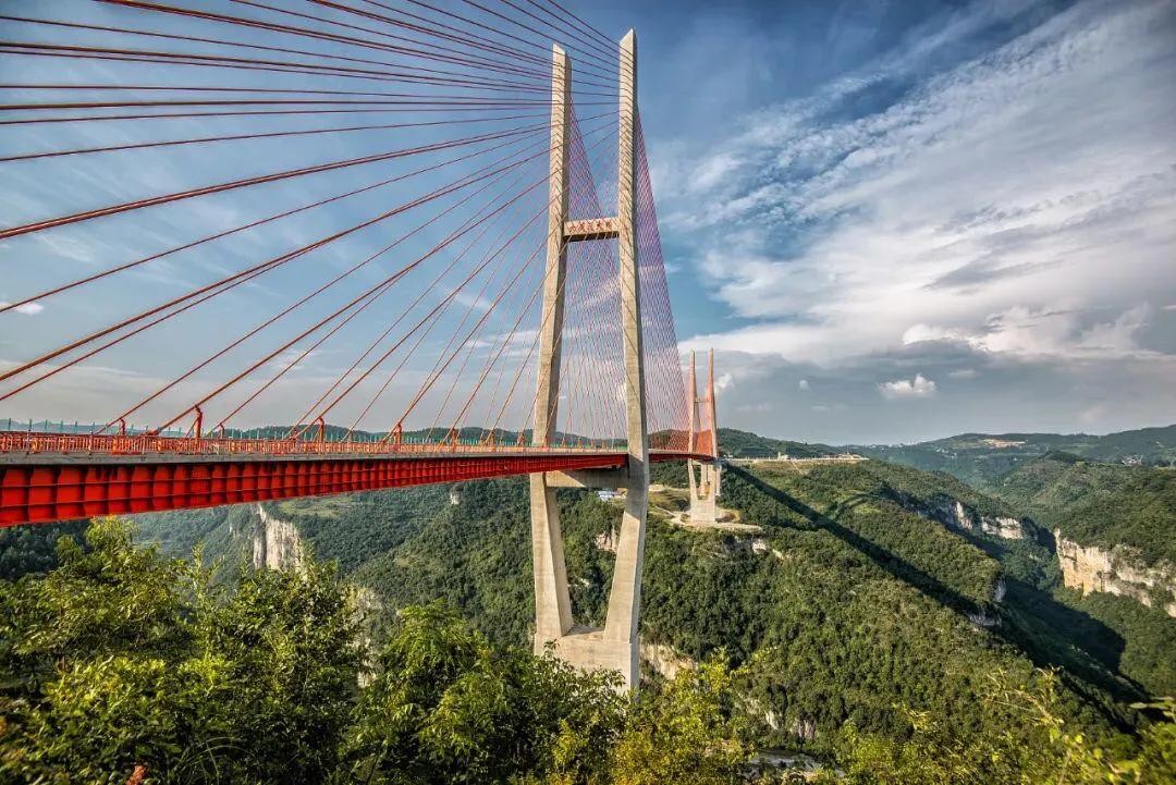 7. 坝陵河大桥:坝陵河大桥位于贵州省安顺市关岭布依族苗族自治县关索岭和晒甲山之间,跨越坝陵河峡谷。它以370米的高度成为世界十大最高桥梁之一。