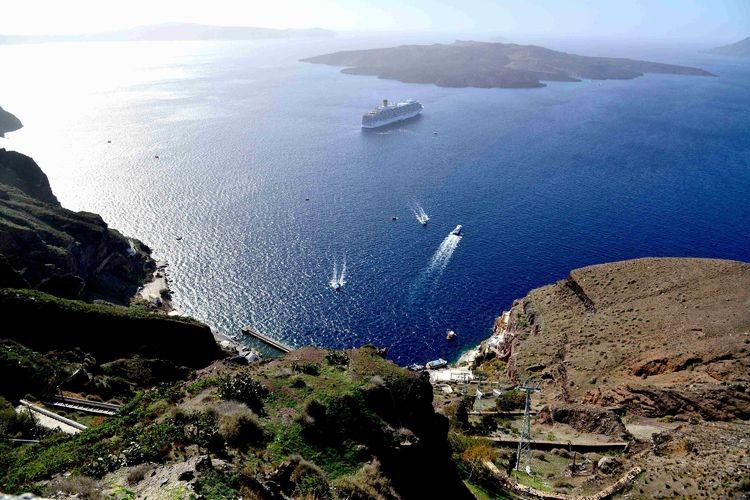 我们乘蓝星号轮船,从雅典到圣托里尼岛,轮船在爱琴海上行驶了8小时。