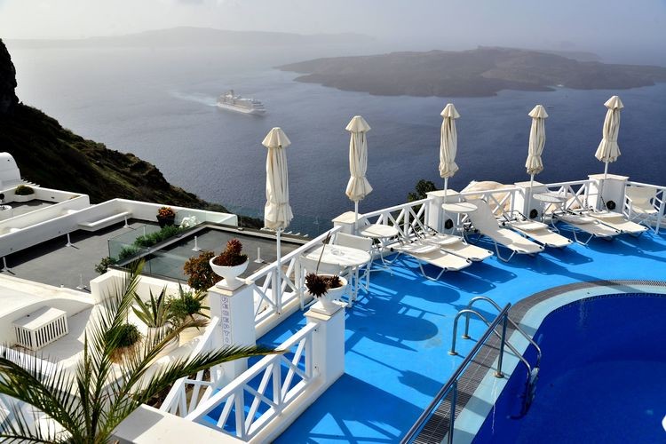 因为是淡季,从雅典到圣岛的船,只有一班,空位很多。船上的座位不固定,可以自由选择,行李随身携带。我们入住了两个悬崖酒店,第一个悬崖酒店是在新港码头上方的山上。
