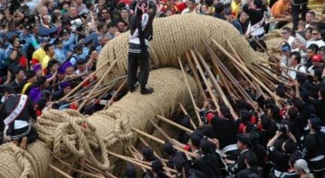 世界之大无奇不有,说拔河比赛连小学生都知道,但这样大型的拔河比赛你绝对是第一次听说。日本的那霸大纲挽节日当天,所有的人汇聚在街上,参加拔河比赛。拔河比赛能有多大场面你一定想不到了。光这绳子就重43吨,长200米,现场2万人参加,同时用力才能拉动这绳子呢!