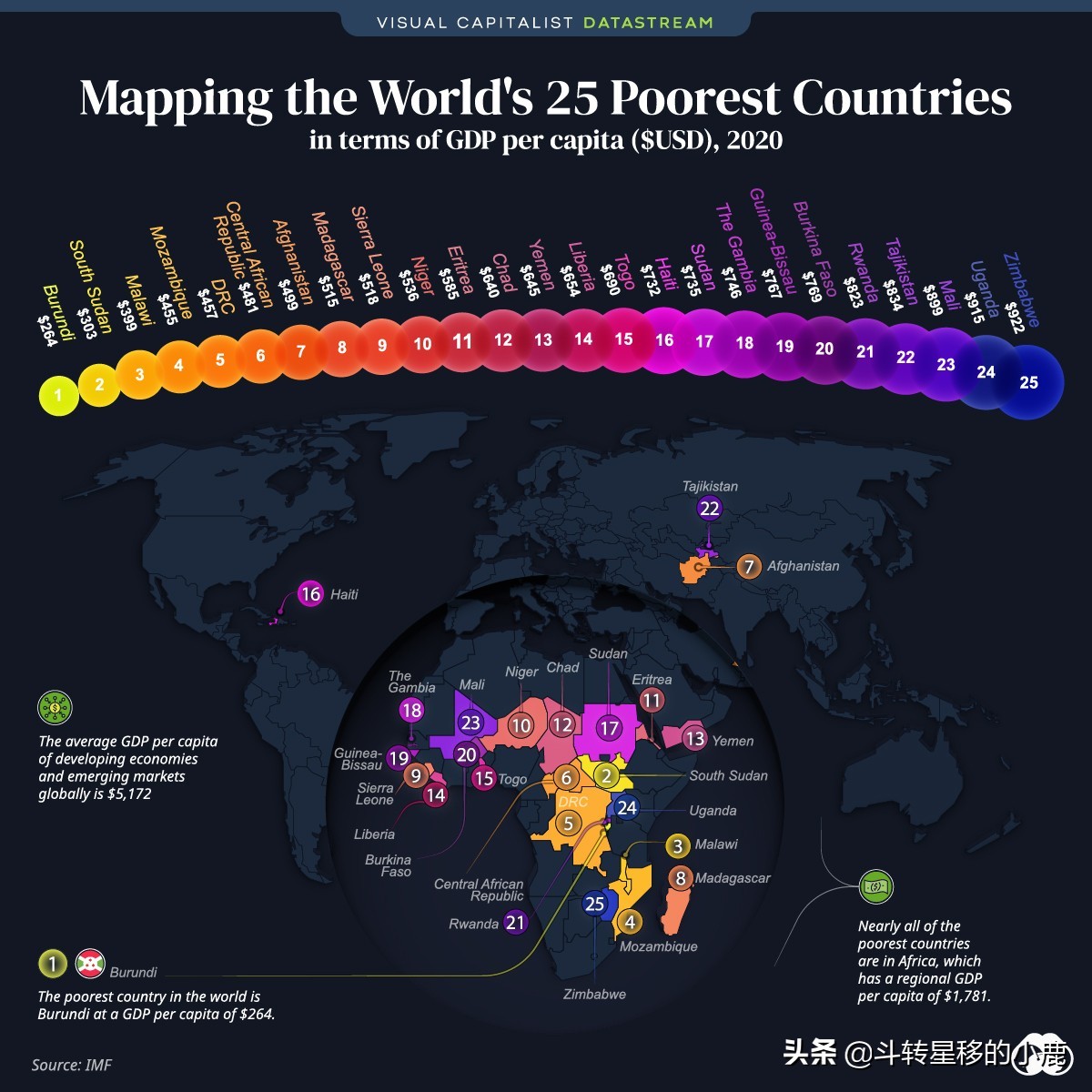 这张地图根据这个指标显示了世界上 25 个最贫穷的国家。