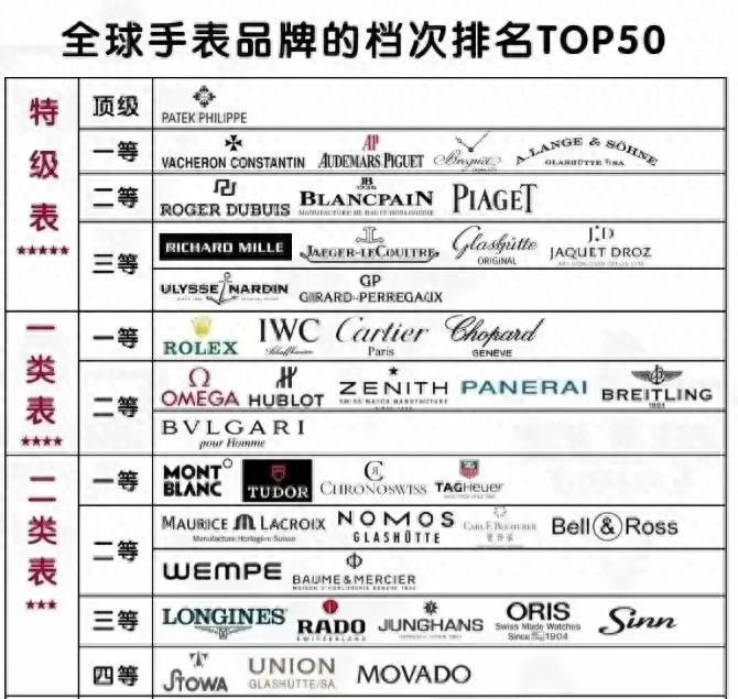 经过市场的激烈竞争,消费者对手表品牌的认知形成了一种层级结构。目前,全球手表品牌中排名前五十的品牌已经受到普遍认可,其中最知名的十大品牌如下: