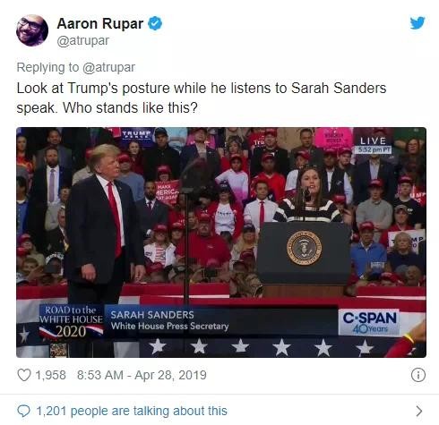 有心细的民众发现,在公布身高后,特朗普的身姿就时常前倾,像一个刚学会穿高跟鞋的女性。