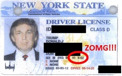更有人挖出特朗普当年的驾照,上面清楚地记录了特朗普6.2英尺的身高。