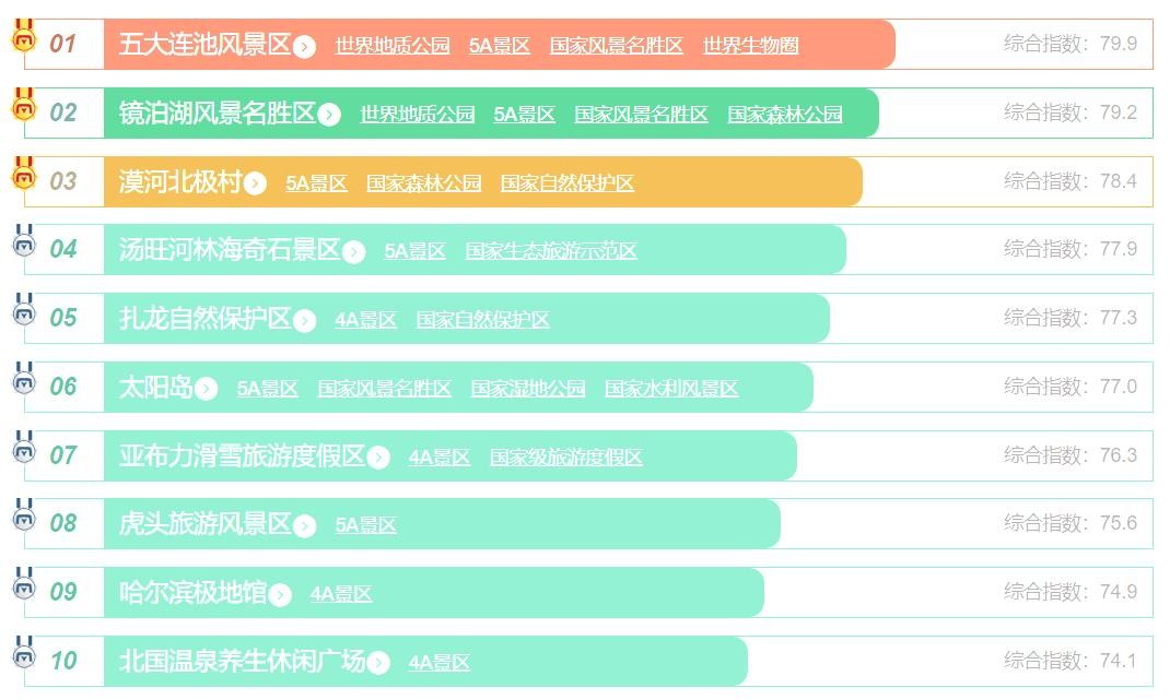 黑龙江最值得去的十大景点排名第一的还是五大连池景区,位列第二的还是镜泊湖景区,位列第三的是漠河的北极村。