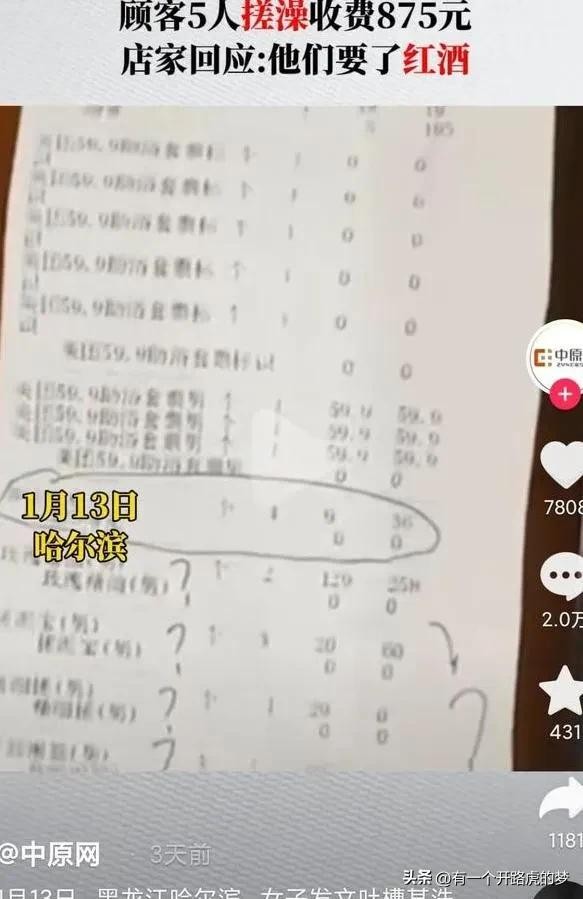 ### 描述:最近,一则消息在哈尔滨网络疯传:五位姑娘去搓澡,结果竟然花了671元!心痛的她们无奈地发文吐槽,引发社交平台热议。今天,《头条号》调查组深入探访当晚现场,曝光这家搓澡店的暗黑套路!亲身经历者爆料,你绝对不能错过!