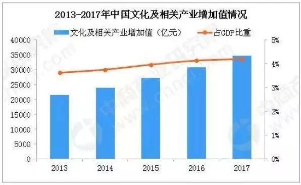 公开资料显示,2013年文化及相关产业增加值21351亿元,占GDP比重3.63%;2016年文化及相关产业增加值突破3万亿元,占比突破4%;2017年逼近35000亿元,达到34722亿元,占GDP比重4.20%。
