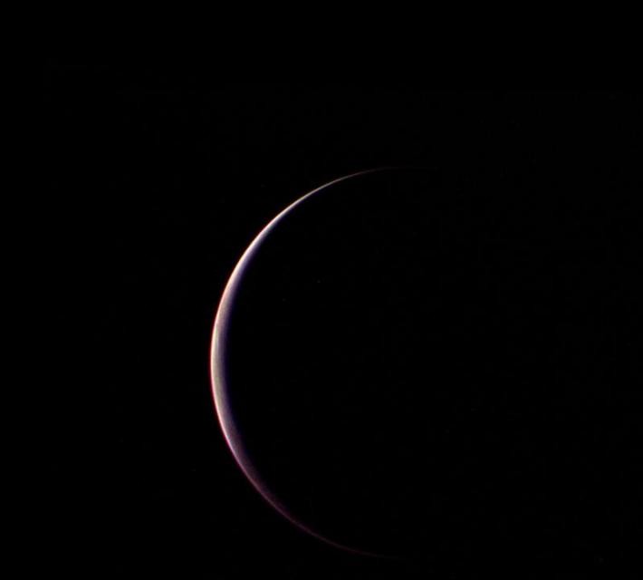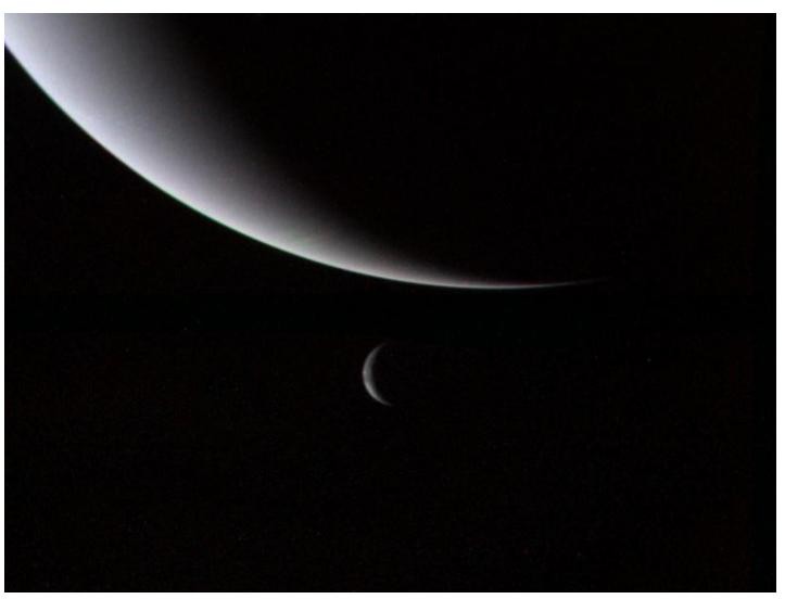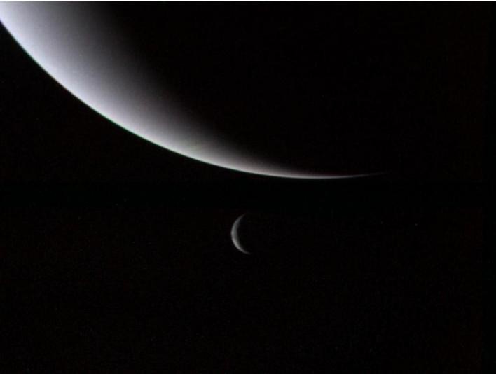 图解:1989年8月25日早晨,旅行者2号在经过海王星“近地点”并穿过其阴影后不久,拍摄到了海王星最大的卫星海卫一的临别照片。