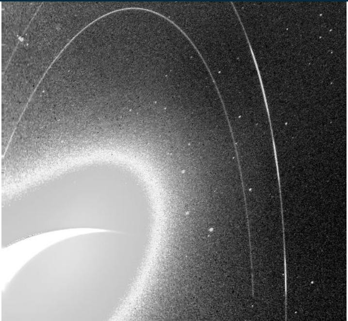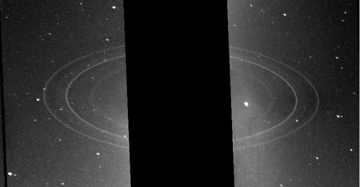 图解:这对旅行者2号图像(FDS 11446.21和11448.10),通过广角相机的透明滤镜获得的两张经591s曝光的照片,在灵敏度最高的条件下展现的全环系统。