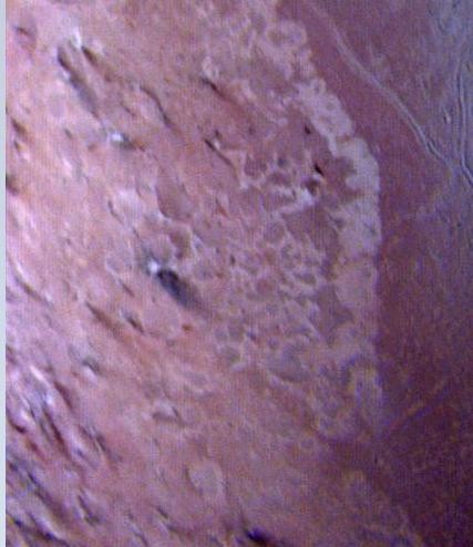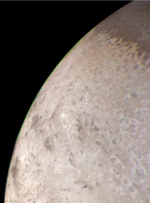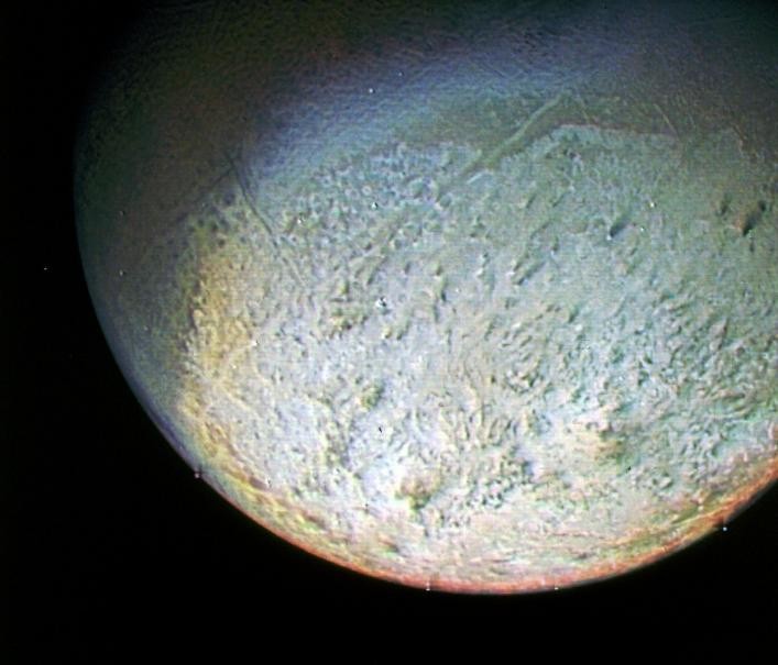 图解:这张海卫一分支的自然彩色照片拍摄于1989年8月25日清晨,当时旅行者2号宇宙飞船距离这颗冰冷的卫星约21万公里(12.8万英里)。