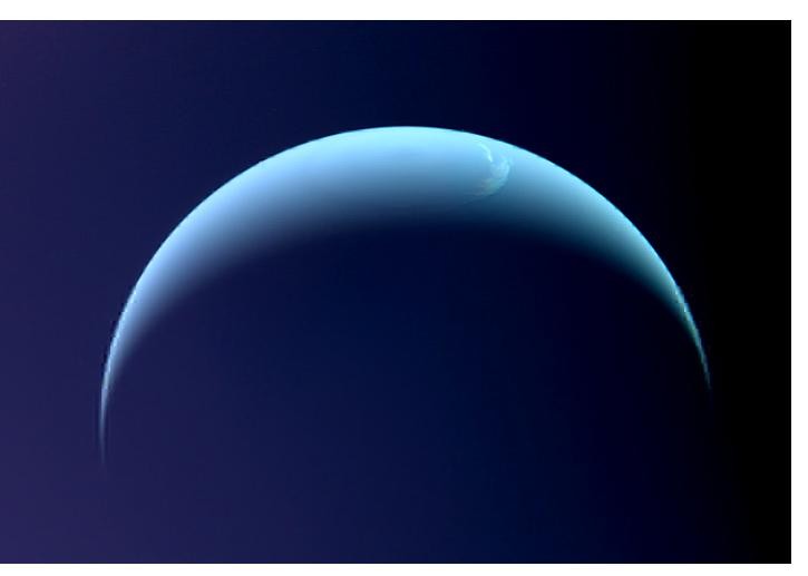 图解:这张海王星图片是由旅行者2号的窄视场相机配上绿色和橙色滤镜后合成的最后一张海王星全景图。