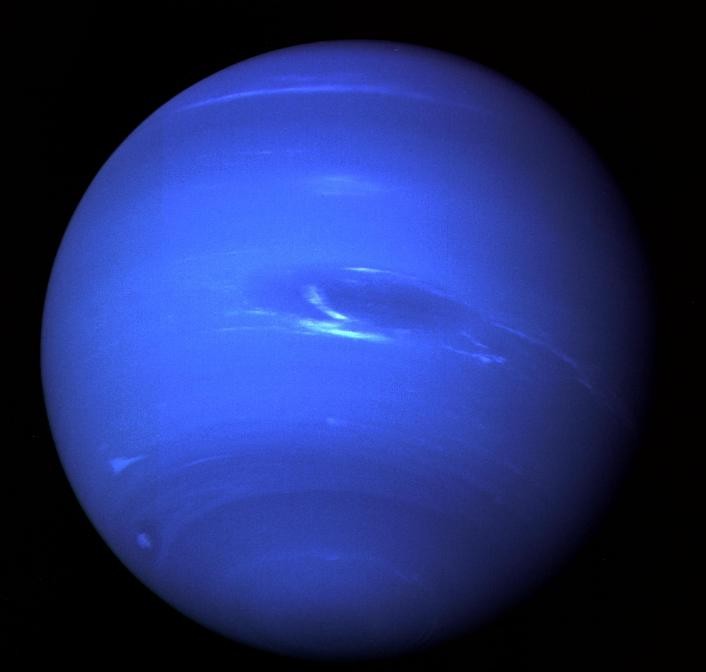 图解:这张是由旅行者2号的窄视场相机于1989年8月31号17:00(UTC)拍,经业余处理后的海王星照片。
