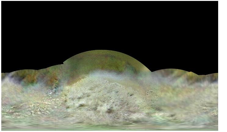图解:旅行者2号于1989年飞越海王星系统时拍摄的海卫一全景彩色拼接图。