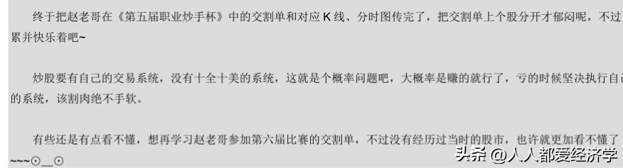 从赵老哥的部分交割单可以看出,2010年实盘炒股大赛中,赵老哥操盘手法之一还是打首板或突破板,要知道他是2014年操作中国中车一战跨入10亿级别门槛的。2010年,当时赵老哥的资金量大概二三百万元级别的,2014年就达到了10亿级别,复利真的是人类第九大奇迹。