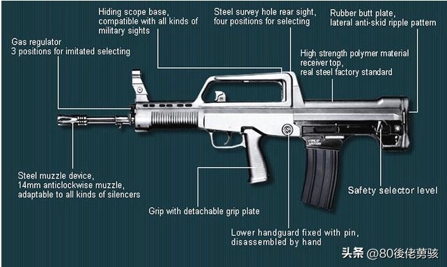 另外,需要说明的是,为打开国际市场,后来还在95式突击步枪基础上改装研制了一款采用北约制式的5.56毫米弹药、使用北约制式M16突击步枪金属弹夹的97式突击步枪,并主要用于出口使用。