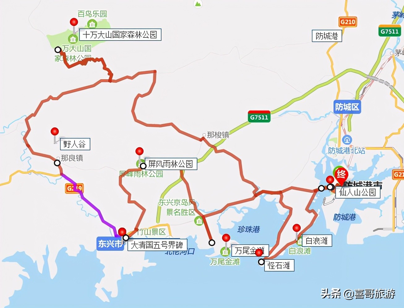 2、防城港十大景点自驾游行程路线:防城港-仙人山公园-白浪滩-怪石滩-万尾金滩-东兴屏风雨林公园-东兴口岸-中越友谊大桥-大清国五号界碑-野人谷-十万大山国家森林公园-防城港。