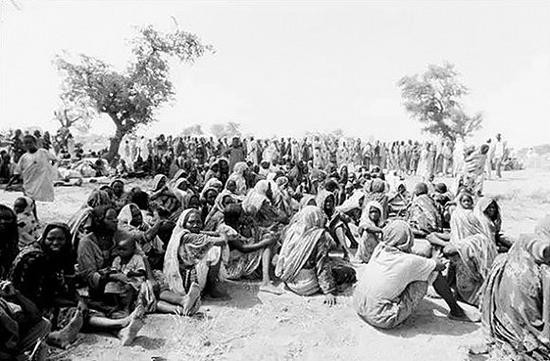贫瘠的土地上,成群的难民等候在联合国人道救援组织帐篷外,他们一个个面黄肌瘦、衣衫褴褛,由于饥饿,很多人已经站立不住。